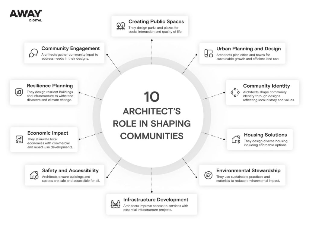 Architecture helps shape community identity by reflecting cultural values and fostering a sense of belonging. Iconic buildings, public spaces, and neighbourhood designs contribute to the unique character of communities, influencing how residents perceive and interact with their surroundings.